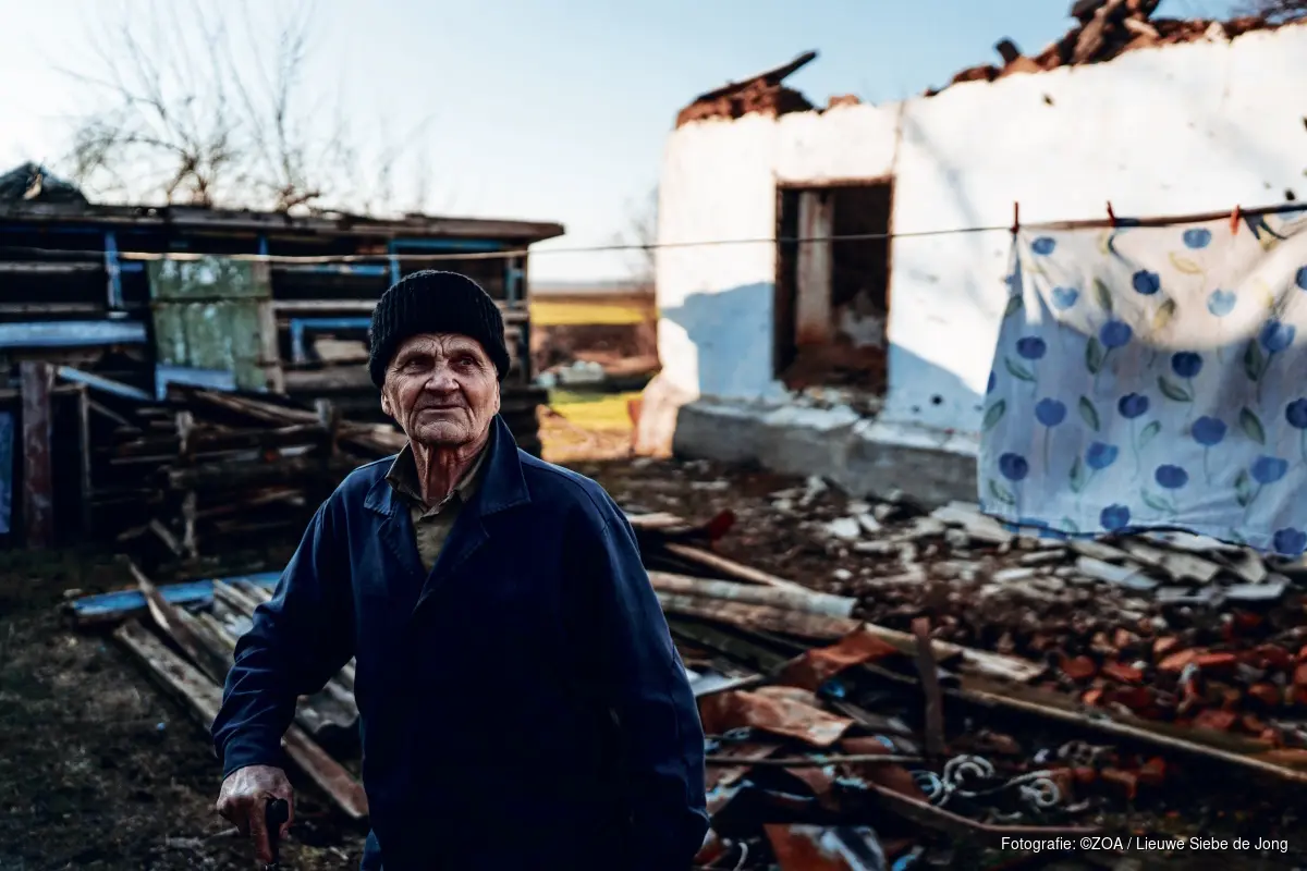 In het verwoeste dorp Trudoliubivka in Oekraïne zit Viktor Yarosjenko (83) in zijn kapotte keuken. Het is het enige deel van zijn huis dat nog overeind staat na een raketaanval. “Die raket was voor mij bedoeld”, zegt hij zacht. “Maar ik was net op tijd weg.”