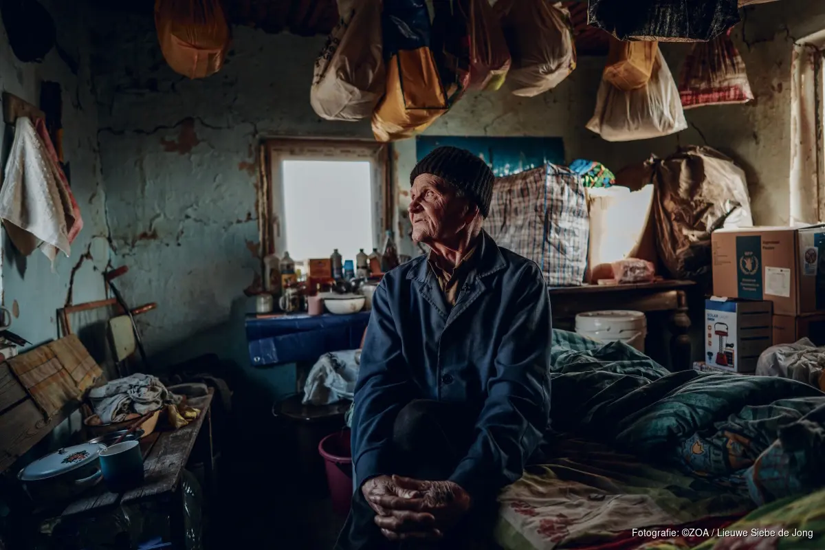 Zijn ogen dwalen af naar de muur, waar ooit foto’s hingen van zijn kinderen en kleinkinderen. Viktor woont alleen. Zijn buren zijn gevlucht, maar hij bleef. “Waar moet ik heen? Dit is mijn thuis.”