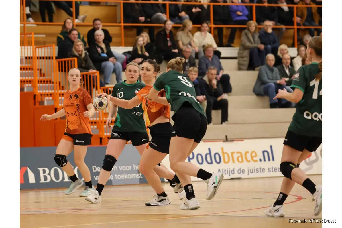 Slechts eenmaal liep het verschil op tot meer dan twee doelpunten. Dat gebeurde in de 45e minuut, toen Anne Hemmer DSVD naar een 19-22 voorsprong schoot. Verder bleven de ploegen elkaar steeds dicht op de hielen zitten.